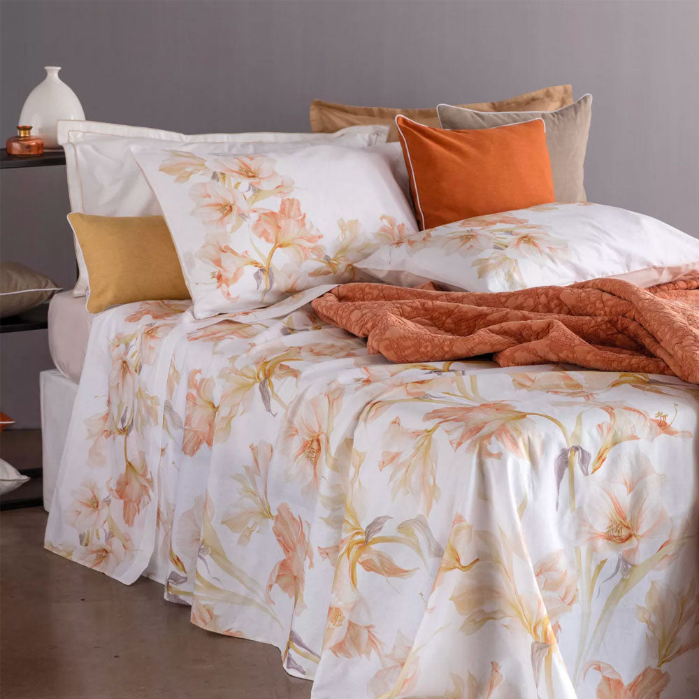 Realizzate in pregiato percalle di cotone 100%, presentano un elegante motivo floreale con amarillis nei raffinati toni del rame e del beige. Ogni dettaglio è pensato per coniugare bellezza estetica e praticità: il tessuto morbido garantisce un riposo confortevole, mentre la resistenza del cotone assicura durabilità nel tempo.