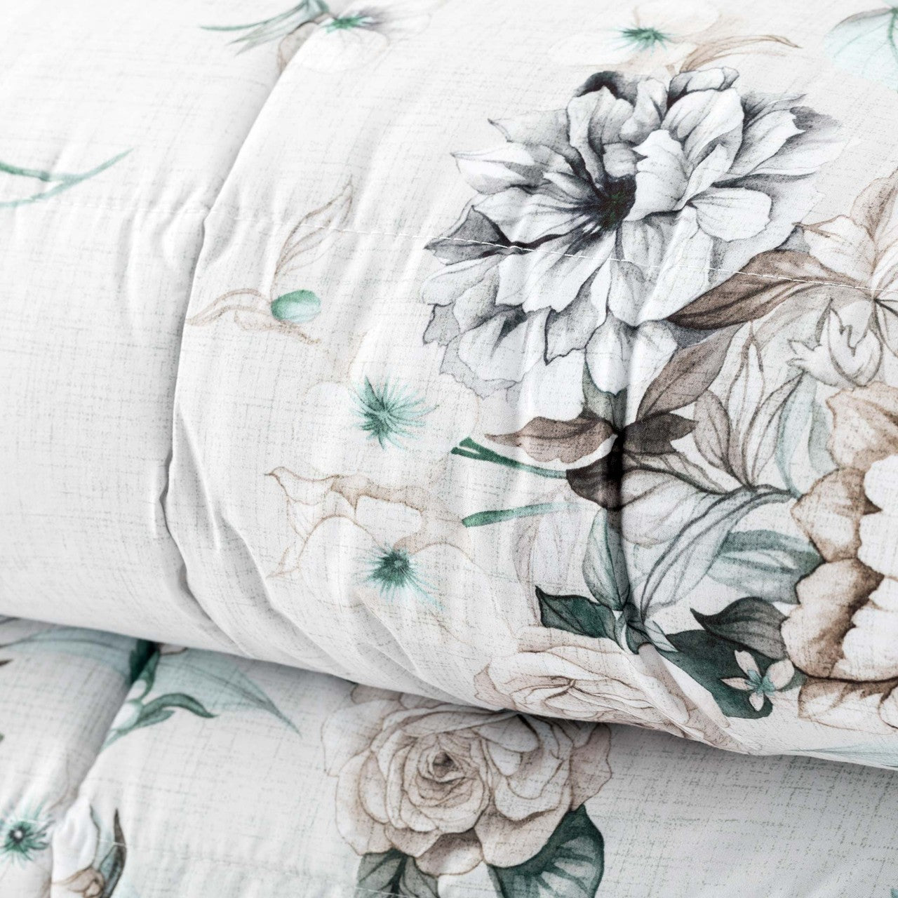 Trapuntatura piazzata a quadri con 3 cornici e 2 angoli tondi; la trapunta ha un'imbottitura di 350gr 100% poliestere.