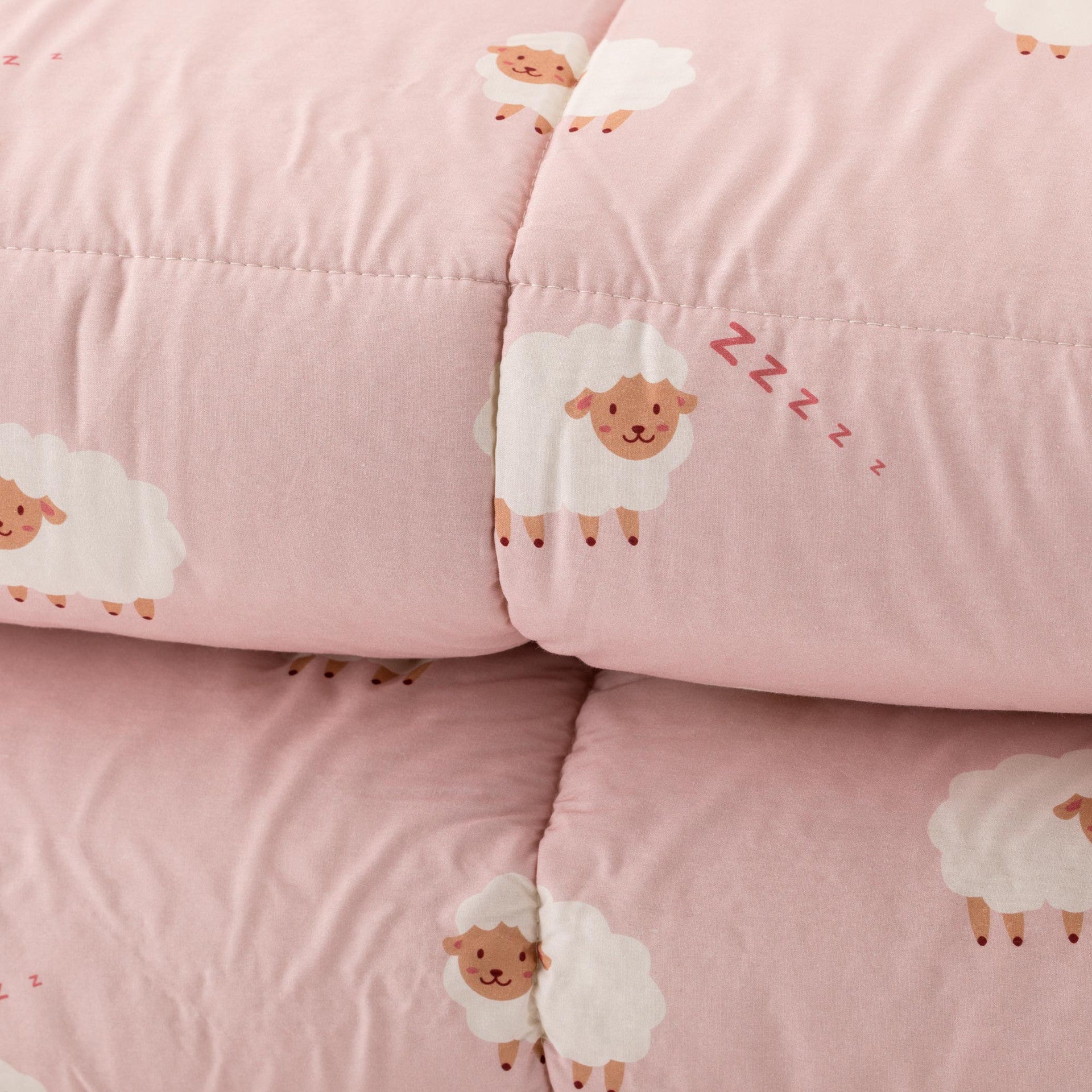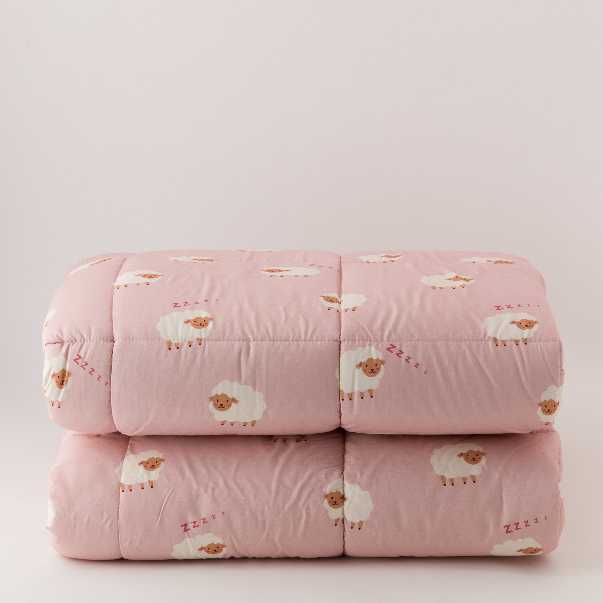 I motivi rosa con teneri dettagli animaletti creano un'atmosfera rassicurante e fiabesca che accompagna serenamente il riposo. La trapuntatura a quadri con cornice definita e gli angoli arrotondati regalano un profilo morbido e raffinato.